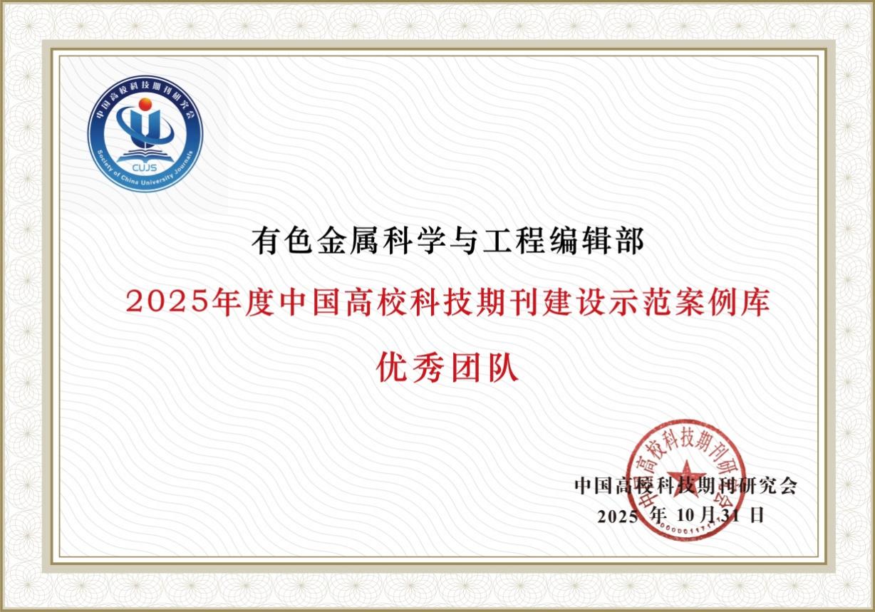 另悉,11月6日至9日于西安举办的中国高校科技期刊研究会第29次年会上,《有色金属科学与工程》再获两项荣誉。经过征集、推荐、审核及编校质量抽查等多轮程序,《有色金属科学与工程》编辑团队获评“2025年度中国高校科技期刊建设示范案例库·优秀团队”,编辑部朱冬梅同志入选“优秀编辑”。