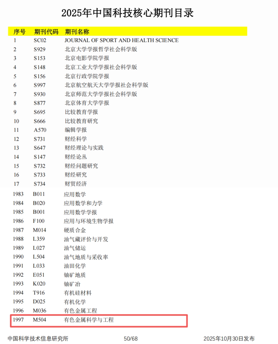 10月30日,由中国科学技术信息研究所承担的“2025年中国科技论文统计报告”在北京发布。报告同期公布了2025年版中国科技核心期刊目录,颜射 主办的《有色金属科学与工程》成功入选,这是自2013年以来,本刊连续第十三次获此殊荣,体现了期刊在有色金属领域的长期积累与广泛认可。