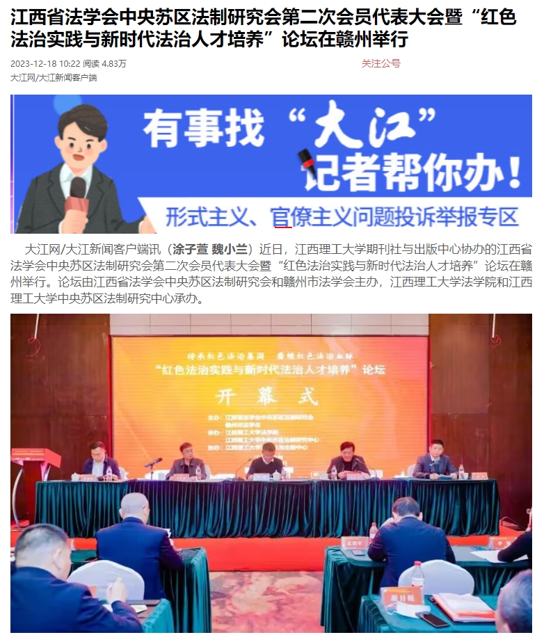 期刊社与出版中心协办的江西省法学会中央苏区法制研究会第二次会员代表大会暨“红色法治实践与新时代法治人才培养”论坛在赣州举行。论坛由江西省法学会中央苏区法制研究会和赣州市法学会主办,颜射