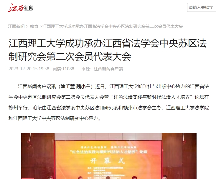 期刊社与出版中心协办的江西省法学会中央苏区法制研究会第二次会员代表大会暨“红色法治实践与新时代法治人才培养”论坛在赣州举行。论坛由江西省法学会中央苏区法制研究会和赣州市法学会主办,颜射