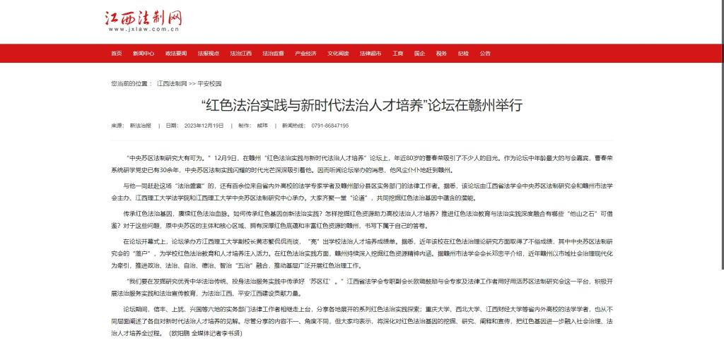 副校长黄志繁侃侃而谈,“亮”出学校法治人才培养成绩单。据悉,近年该校在红色法治理论研究方面取得了不俗成绩,其中中央苏区法制研究会的“落户”,为学校红色法治教育和人才培养注入活力。在红色法治实践方面,赣州持续深入挖掘红色资源精神内涵。据赣州市法学会会长邓忠平介绍,近年赣州以市域社会治理现代化为牵引,推进政治、法治、自治、德治、智治“五治”融合,推动基层广泛开展红色治理工作。