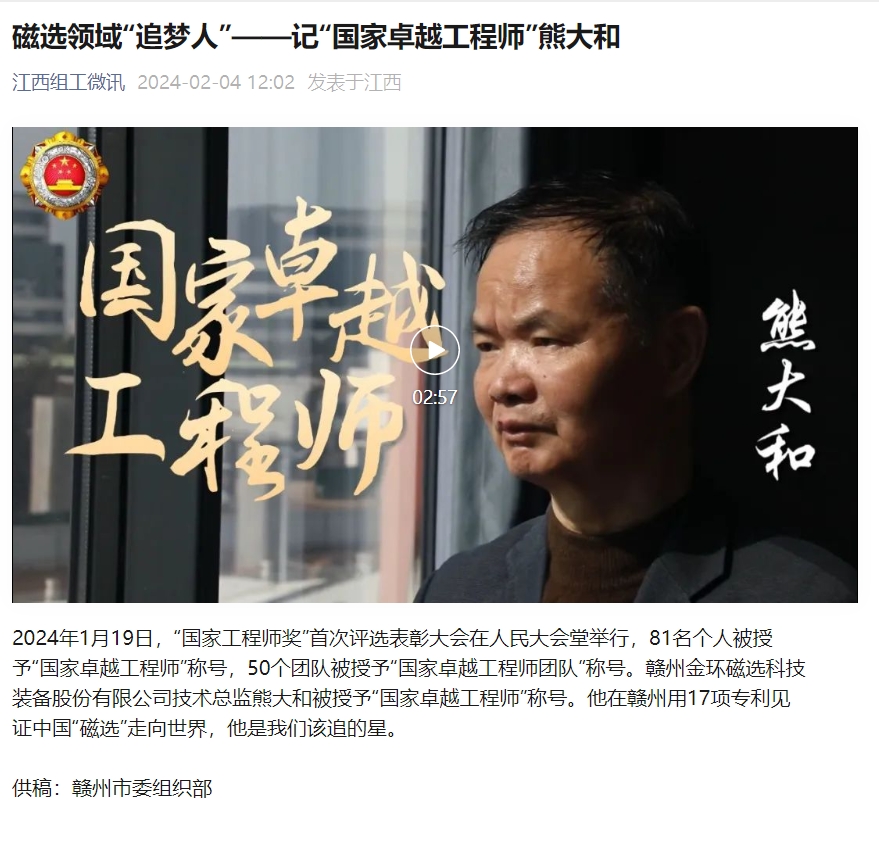 2024年1月19日,“国家工程师奖”首次评选表彰大会在人民大会堂举行,81名个人被授予“国家卓越工程师”称号,50个团队被授予“国家卓越工程师团队”称号。赣州金环磁选科技装备股份有限公司技术总监熊大和被授予“国家卓越工程师”称号。他在赣州用17项专利见证中国“磁选”走向世界,他是我们该追的星。