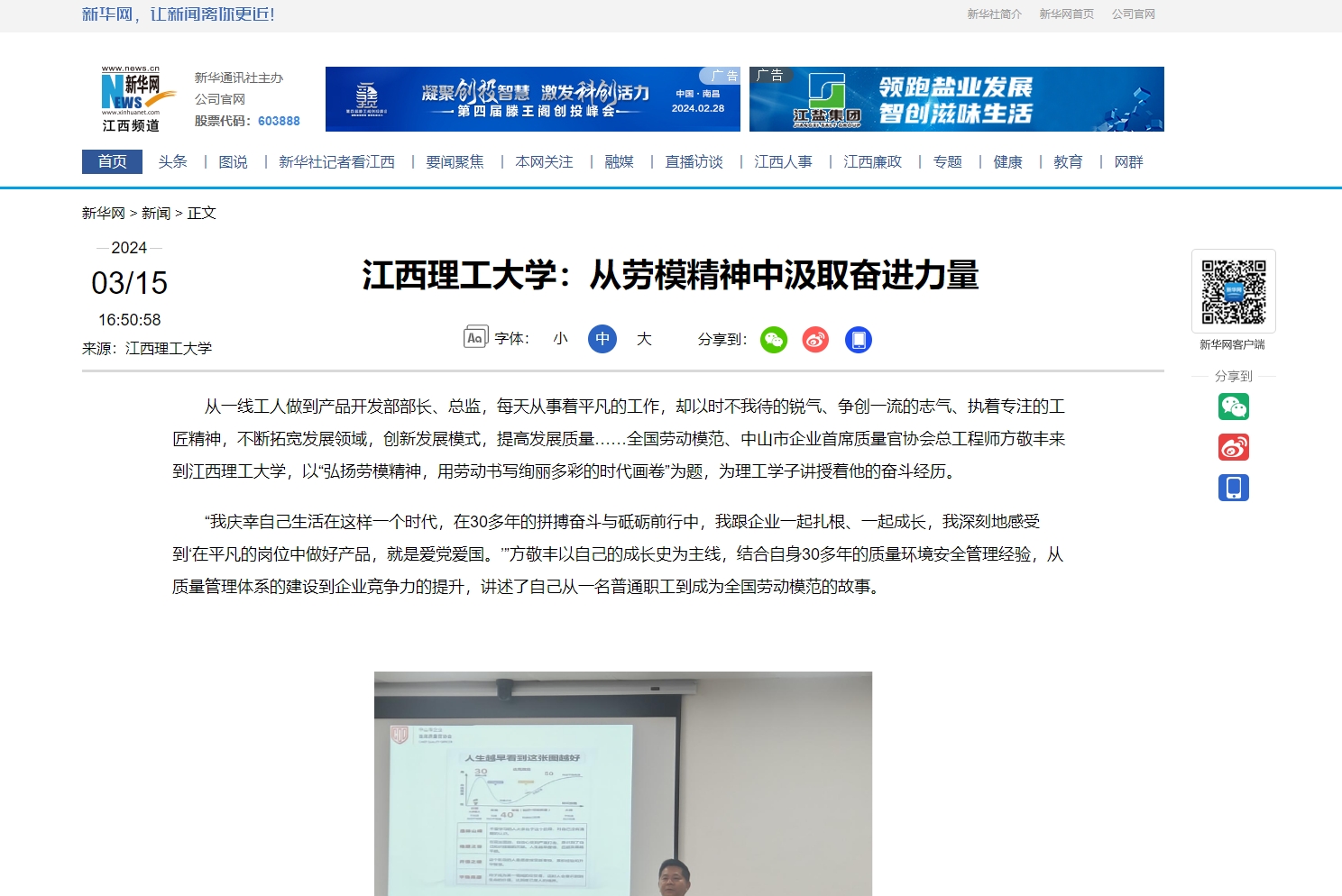 “我庆幸自己生活在这样一个时代,在30多年的拼搏奋斗与砥砺前行中,我跟企业一起扎根、一起成长,我深刻地感受到‘在平凡的岗位中做好产品,就是爱党爱国。’”方敬丰以自己的成长史为主线,结合自身30多年的质量环境安全管理经验,从质量管理体系的建设到企业竞争力的提升,讲述了自己从一名普通职工到成为全国劳动模范的故事。