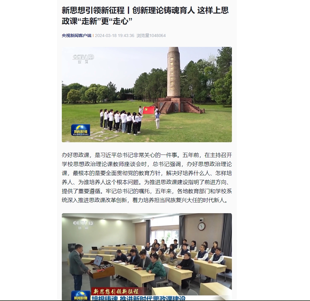 《中央电视台新闻联播》:新思想引领新征程丨创新理论铸魂育人 这样上思政课“走新”更“走心”