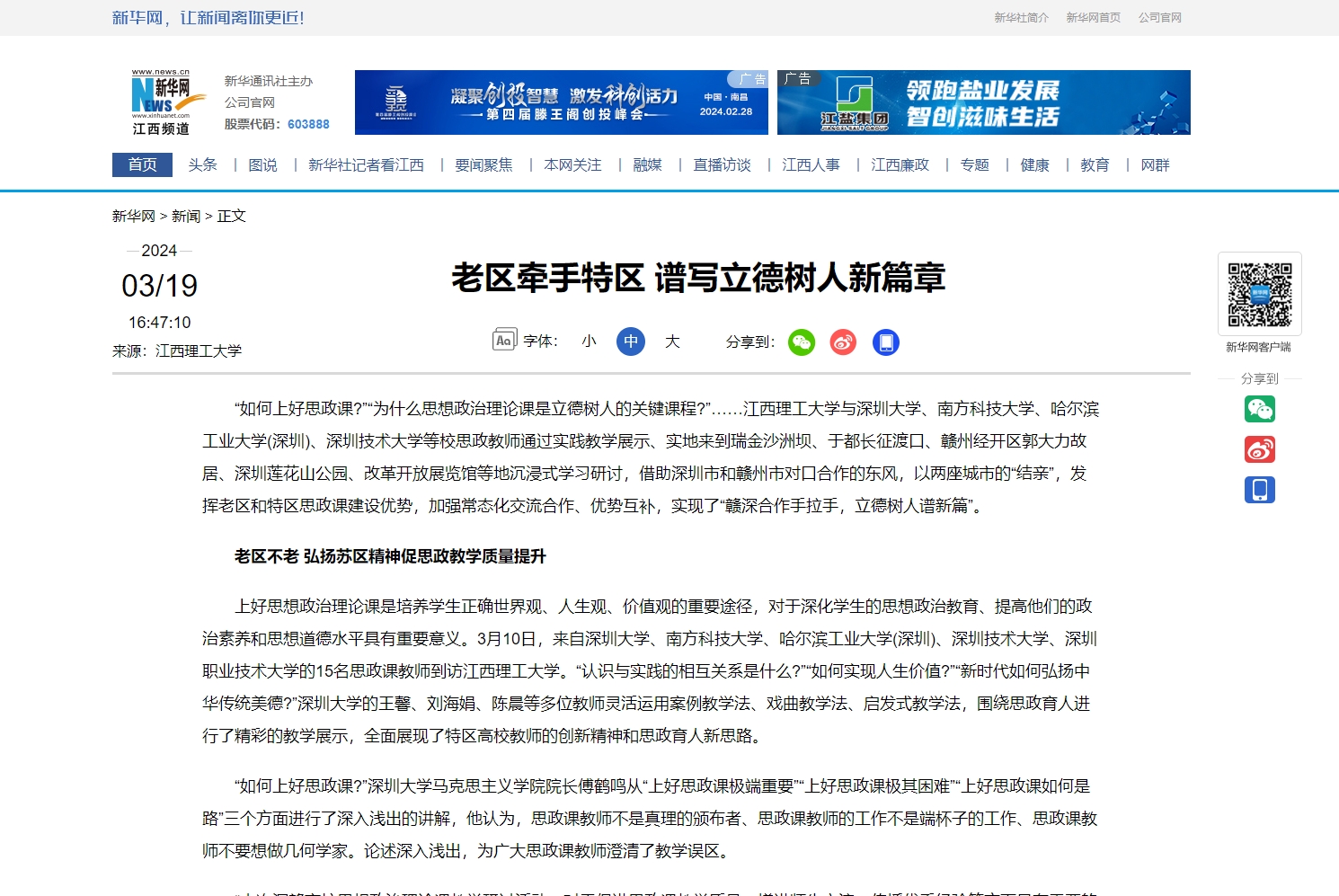 与深圳大学、南方科技大学、哈尔滨工业大学(深圳)、深圳技术大学等校思政教师通过实践教学展示、实地来到瑞金沙洲坝、于都长征渡口、赣州经开区郭大力故居、深圳莲花山公园、改革开放展览馆等地沉浸式学习研讨,借助深圳市和赣州市对口合作的东风,以两座城市的“结亲”,发挥老区和特区思政课建设优势,加强常态化交流合作、优势互补,实现了“赣深合作手拉手,立德树人谱新篇”。