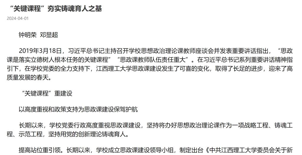 目前,马克思主义学院获批江西省高水平本科教学团队1个、江西省高校思政课教学改革创新团队1个,2人次获批江西省十大优秀思政课教师称号,2人次获评宝钢优秀教师奖。学校思政课教师坚持教学与科研并重、两条腿走路,国家级一流本科课程获得突破,国家社科基金高校思政课研究专项获得突破,思政课教师以更高的教学水平和理论素养推动思想政治理论课高质量发展。