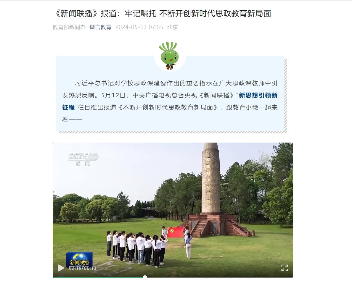 《教育部官微》:《新闻联播》报道:牢记嘱托 不断开创新时代思政教育新局面