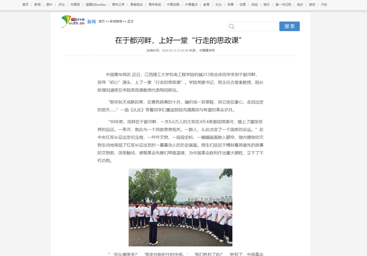 “‘你从哪里来?’‘我来自新时代的中国。’‘我们胜利了吗?’‘胜利了,中国革命胜利了!’……”中央红军长征纪念碑前,机械233班团员代表通过“跨越时空的对话”,为全体师生上了一节精彩的团课。同学们仿佛穿越到了当年红军惊心动魄的渡河现场。历史与现实贯通,时间与空间融合,通过这场“跨时空的对话”,师生们跨越历史长河,重温峥嵘岁月,筑牢理想信念。