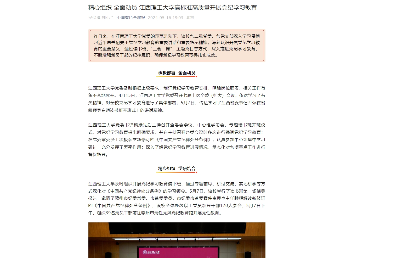 党委召开七届十次全委(扩大)会议,传达学习了有关精神,对全校党纪学习教育进行了具体部署;5月7日,传达学习了江西省委书记尹弘在省级领导专题读书班开班式上的讲话精神。