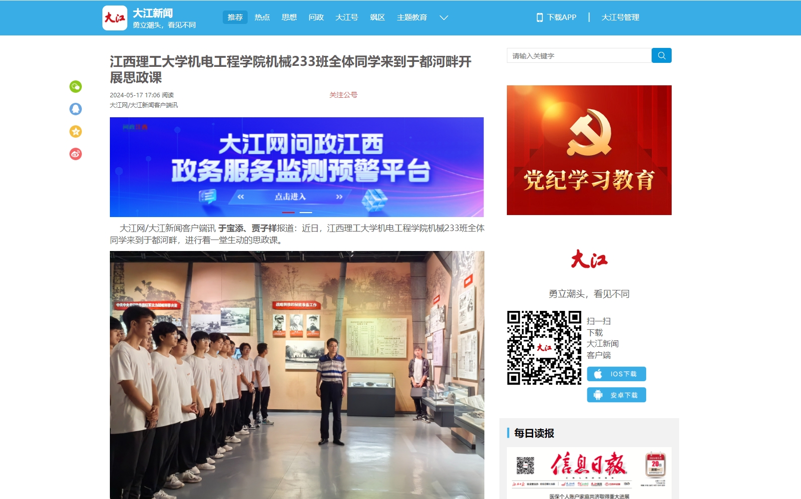 大江网/大江新闻客户端讯于宝添、贾子祥报道:近日,颜射 机电工程学院机械233班全体同学来到于都河畔,进行着一堂生动的思政课。