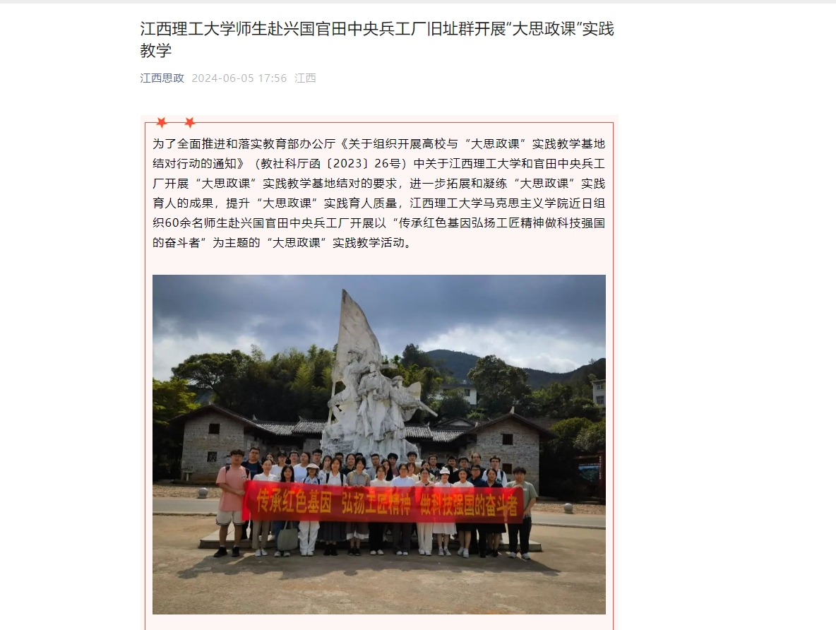 马克思主义学院近日组织60余名师生赴兴国官田中央兵工厂开展以“传承红色基因弘扬工匠精神做科技强国的奋斗者”为主题的“大思政课”实践教学活动。