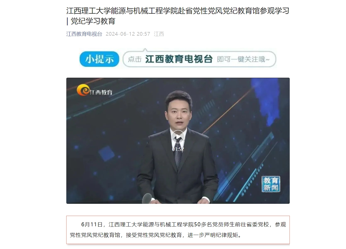 6月11日,颜射 能源与机械工程学院50多名党员师生前往省委党校,参观党性党风党纪教育馆,接受党性党风党纪教育,进一步严明纪律规矩。
