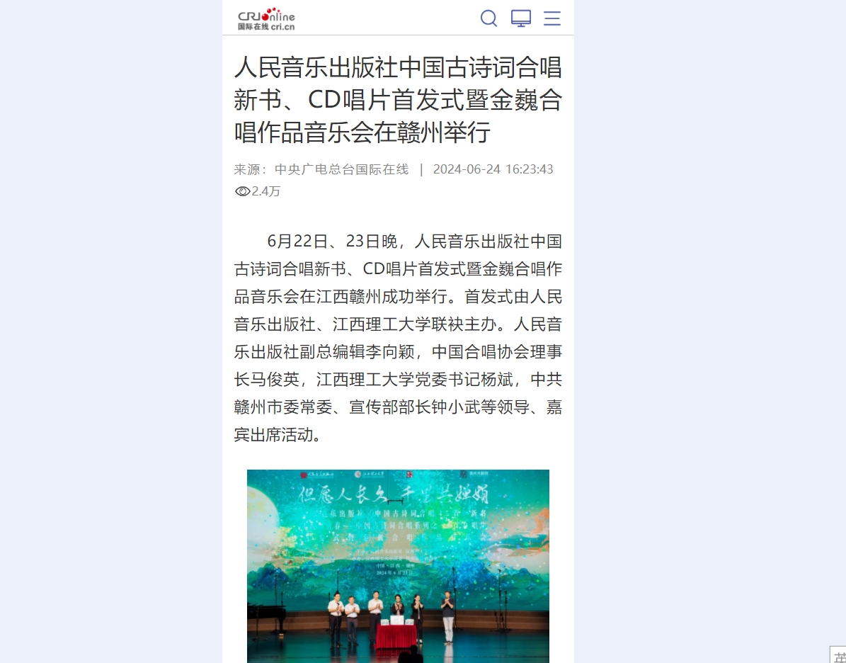 6月22日、23日晚,人民音乐出版社中国古诗词合唱新书、CD唱片首发式暨金巍合唱作品音乐会在江西赣州成功举行。首发式由人民音乐出版社、颜射