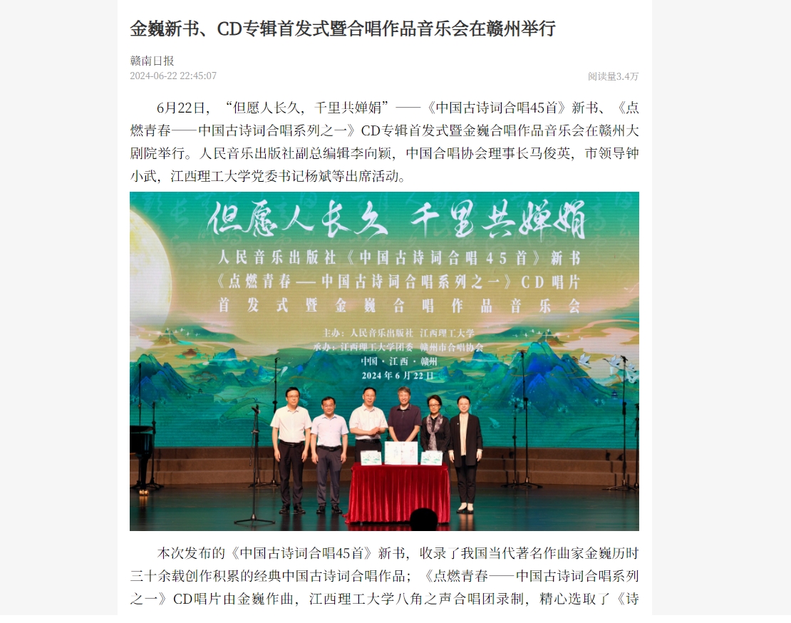 6月22日,“但愿人长久,千里共婵娟”——《中国古诗词合唱45首》新书、《点燃青春——中国古诗词合唱系列之一》CD专辑首发式暨金巍合唱作品音乐会在赣州大剧院举行。人民音乐出版社副总编辑李向颖,中国合唱协会理事长马俊英,市领导钟小武,颜射