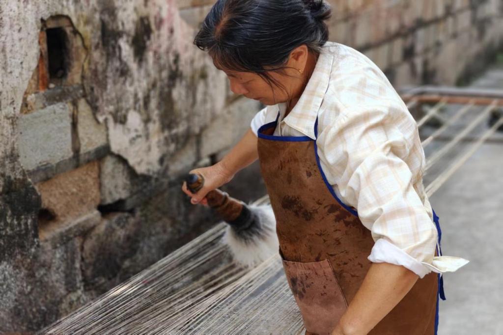 鸣机织苎,经纬流芳。从一团乱麻到一匹坯布,经纬纵横穿梭间时光荏苒,夏布承载着一代代赣南客家人的情感与乡愁,也延续着这千年传统手工技艺的魅力与芬芳。夏布完全由手工织造,工序复杂,体现了中国自古有之的匠人精神。一个织布动作要恰当地控制好力度与速度,并非易事。参访当天,大家既心生自豪,也深切感受到了夏布手艺人的辛苦。“自己上手的感觉真的完全不一样,织布的时候不仅要用眼睛观察,还要注意手脚配合。”实践队员刘慧红感叹道。
