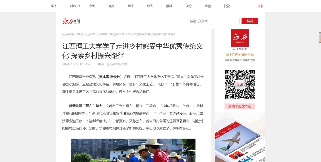 化学化工学院“星火”实践团赴宁都县小源村,立足当地文化特色,实地体验“夏布”文化工艺、“扛灯”“赶集”等民俗活动。深度探寻非遗工艺与民俗文化的魅力,思考乡村振兴新路径。