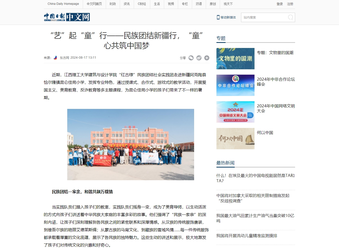 建筑与设计学院“红古绿”民族团结社会实践团走进新疆阿克陶县恰尔隆镇昆仑佳苑小学,发挥专业特色,通过授课式、合作式、游戏式的教学活动,开展爱国主义、美育教育、反诈教育等多主题课程,为昆仑佳苑小学的孩子们带来了不一样的暑期。
