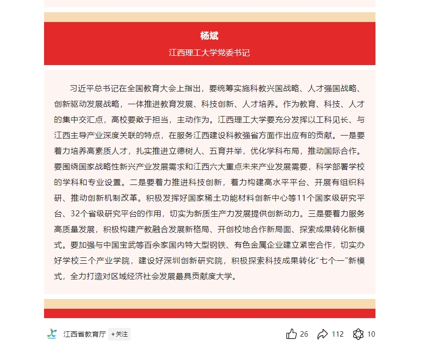要充分发挥以工科见长、与江西主导产业深度关联的特点,在服务江西建设科教强省方面作出应有的贡献。一是要着力培养高素质人才,扎实推进立德树人、五育并举,优化学科布局,推动国际合作。要围绕国家战略性新兴产业发展需求和江西六大重点未来产业发展需要,科学部署学校的学科和专业设置。二是要着力推进科技创新,着力构建高水平平台、开展有组织科研、推动创新机制改革。积极发挥好国家稀土功能材料创新中心等11个国家级研究平台、32个省级研究平台的作用,切实为新质生产力发展提供创新动力。三是要着力服务高质量发展,积极构建产教融合发展新格局、开创校地合作新局面、探索成果转化新模式。要加强与中国宝武等百余家国内特大型钢铁、有色金属企业建立紧密合作,切实办好学校三个产业学院,建设好深圳创新研究院,积极探索科技成果转化“七个一”新模式,全力打造对区域经济社会发展最具贡献度大学。
