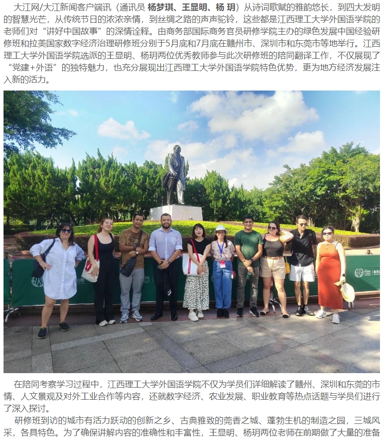外国语学院的老师们对“讲好中国故事”的深情诠释。由商务部国际商务官员研修学院主办的绿色发展中国经验研修班和拉美国家数字经济治理研修班分别于5月底和7月底在赣州市、深圳市和东莞市等地举行。颜射