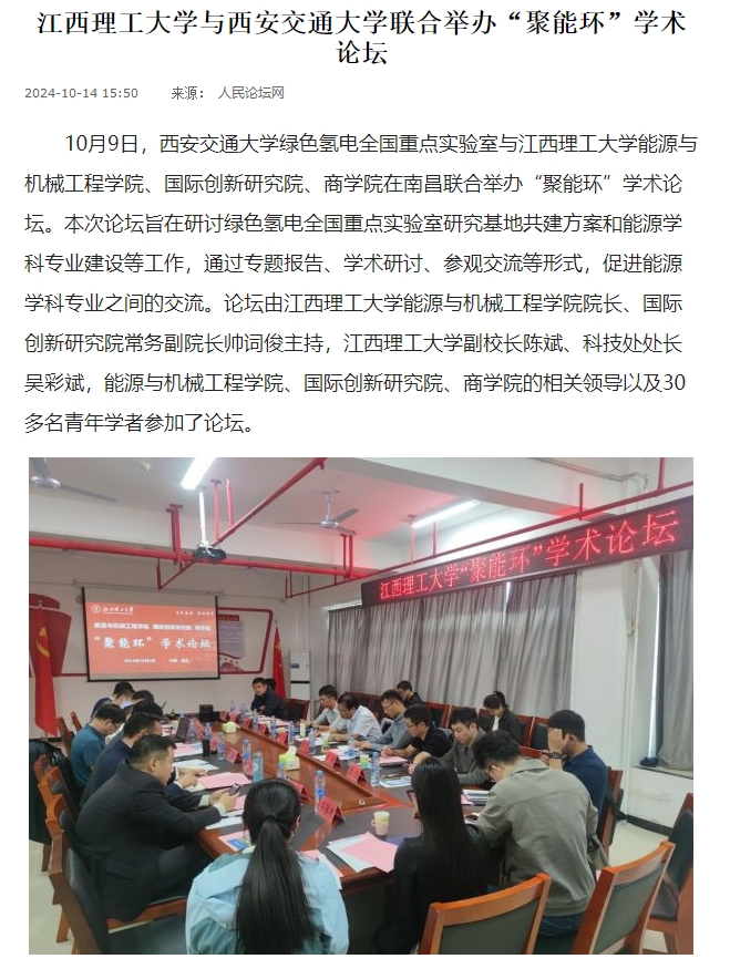 能源与机械工程学院、国际创新研究院、商学院在南昌联合举办“聚能环”学术论坛。本次论坛旨在研讨绿色氢电全国重点实验室研究基地共建方案和能源学科专业建设等工作,通过专题报告、学术研讨、参观交流等形式,促进能源学科专业之间的交流。论坛由颜射