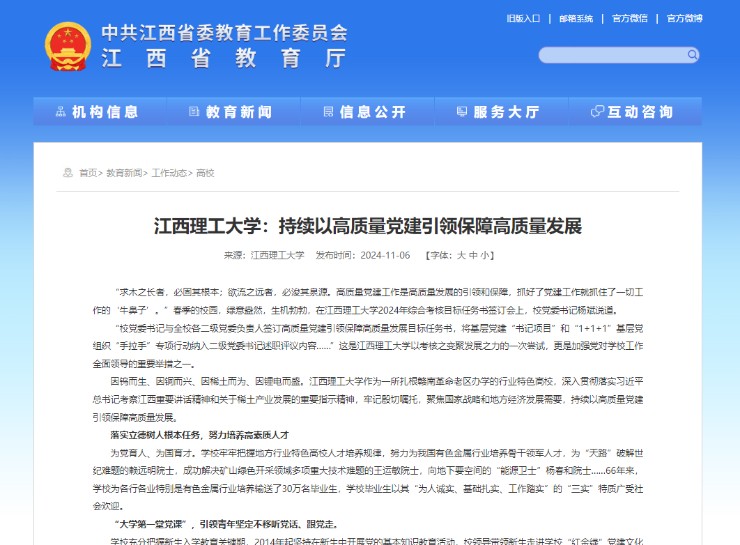 作为一所扎根赣南革命老区办学的行业特色高校,深入贯彻落实习近平总书记考察江西重要讲话精神和关于稀土产业发展的重要指示精神,牢记殷切嘱托,聚焦国家战略和地方经济发展需要,持续以高质量党建引领保障高质量发展。