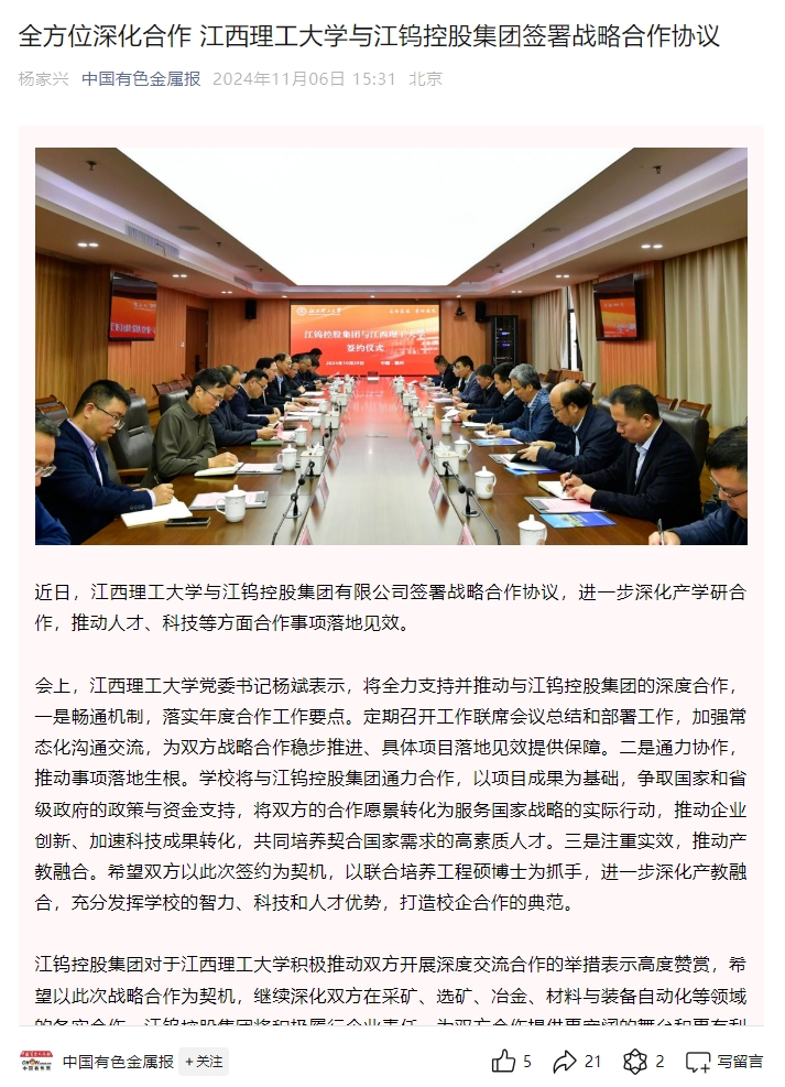 与江钨控股集团有限公司双方签署了战略合作协议、共建先进金属材料江西省实验室合作协议,双方还签订了硕博士联合培养的合作协议和科研项目合同。颜射
