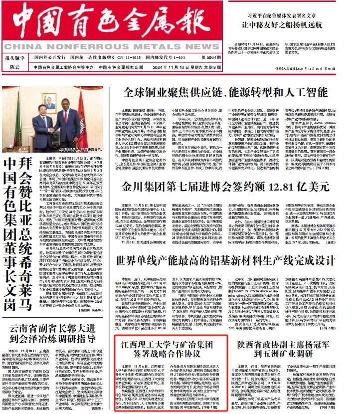 的学科特色与矿冶集团主要业务板块高度吻合。长期以来,双方扎实推进校企合作,在科技合作、人才培养等方面长期保持着紧密联系。他表示,此次合作是双方在新发展阶段谋求更大合作的具体行动,要积极争取政策支持,打造合作样板;要加快整合资源优势,增强合作动力;要不断完善协同机制,保障合作顺畅。他相信,在双方的共同努力下,此次合作将会取得更加丰硕的成果,成为校企合作与产教融合的新典范与新样板。