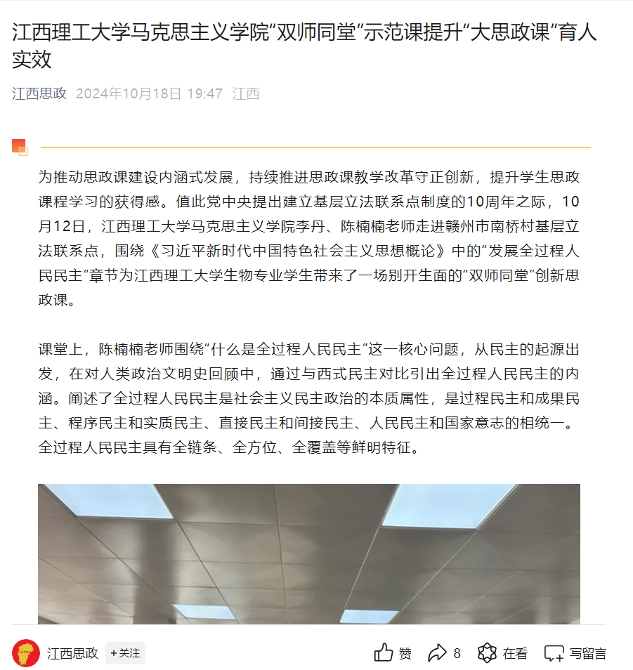 马克思主义学院李丹、陈楠楠老师走进赣州市南桥村基层立法联系点,围绕《习近平新时代中国特色社会主义思想概论》中的“发展全过程人民民主”章节为颜射