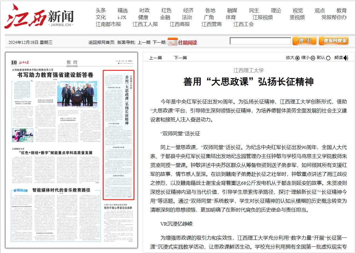 同上一堂思政课,“双师同堂”话长征。为纪念中央红军长征出发90周年,全国人大代表、于都县中央红军长征集结出发地纪念园管理办主任钟敏与学校马克思主义学院教师朱贤凌同授一堂课。钟敏详述中央苏区群众从筹备物资到送子弟参军,如何倾其所有支援红军的故事,情节感人至深。在谈到赣南子弟勇赴长征之壮举时,钟敏重点讲述了湘江战役之惨烈,以及赣南籍战士谢宝金背着重达68公斤发电机从于都走到延安的故事。朱贤凌则深挖长征精神内涵与当代价值,引导学生思索传承路径,探讨“理解新长征”“长征精神今用”等话题。通过“双师同堂”系统教学,学生对长征精神的认知从模糊的历史概念转变为清晰深刻的思想领悟,更加明确了在新时代肩负的历史使命与责任担当。