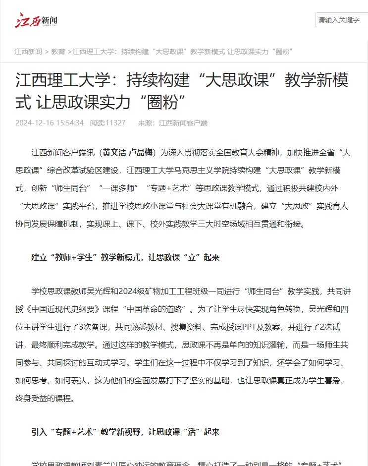 学校思政课教师龚金花与兴国县委党校副校长罗雪娇、龙口镇党委书记娄向南和睦埠村第一书记、赣州市政协文史委副主任宋金辉在兴国县龙口镇睦埠村刘启耀纪念馆,共同为大学生上了一堂以“全面从严治党”为主题的“一课多师”实践教学课,创新了思政课教学模式,为破解理论教学与现实生活脱节的教学难题提供了一条新路径。同时,青年大学生们还自发组织开展了“大学生讲思政课”实践教学活动,围绕在活动中的所见所闻所悟,如党性修养的感悟、刘启耀等革命英雄人物的精神事迹、乡村振兴探索等,精心准备讲稿,并在现场进行了生动的讲解,深化了对党的创新理论的具象化理解和把握,让思政课真正“动”了起来,成为连接理论与实践、历史与现实的桥梁。