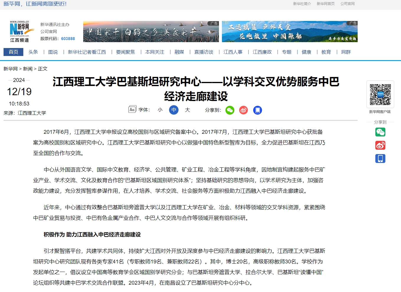 中心从外国语言文学、国际中文教育、经济学、公共管理、矿业工程、冶金工程等学科角度,因地制宜构建起服务中巴矿业产业、学术交流、文化及教育合作的“巴基斯坦区域国别研究体系”;坚持基础研究的思想导向,以学术研究为主体,加强咨政能力建设,充分发挥智库参谋作用,在人才培养、学术交流、社会服务等方面积极助力江西融入中巴经济走廊建设。