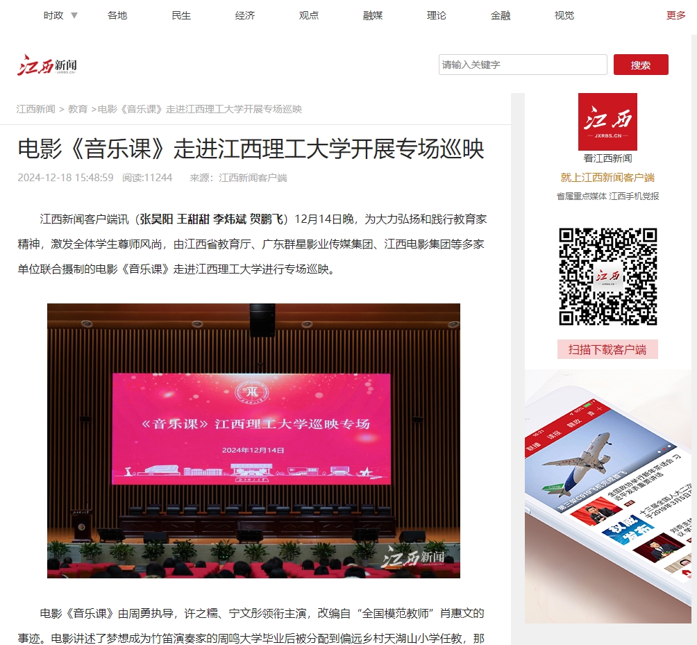 12月14日晚,为大力弘扬和践行教育家精神,激发全体学生尊师风尚,由江西省教育厅、广东群星影业传媒集团、江西电影集团等多家单位联合摄制的电影《音乐课》走进颜射
