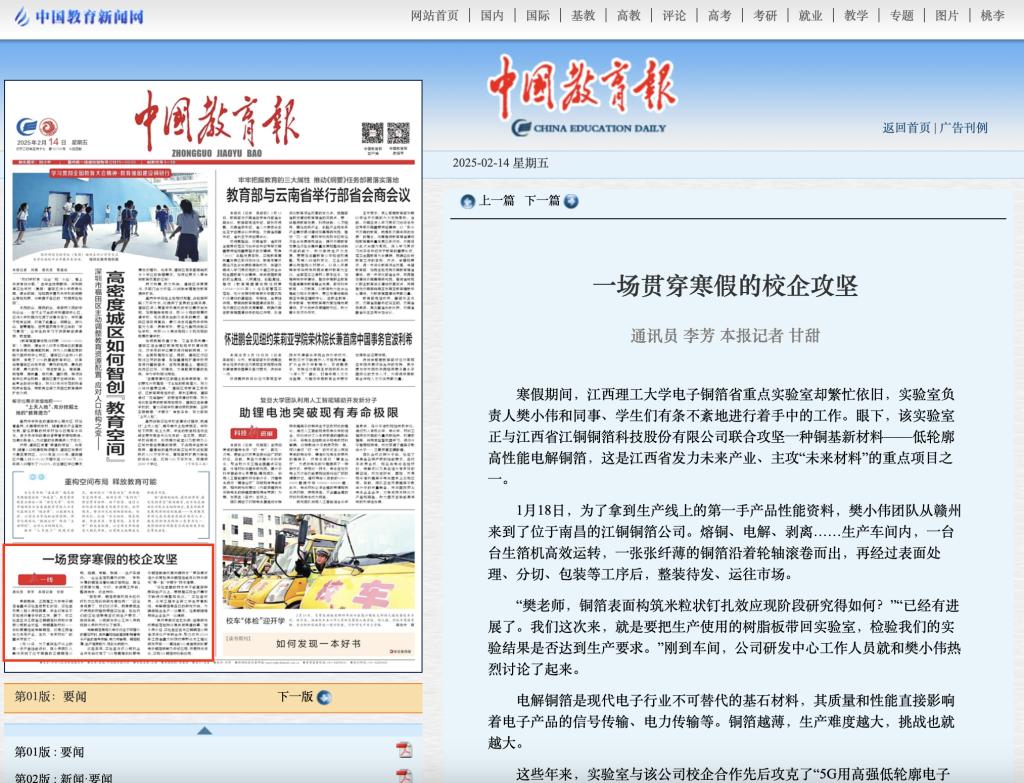 “虽然寒假还在忙科研,但是研究成果能落地转化是件很幸福的事。”樊小伟介绍,实验室正在与江铜铜箔公司继续深化产学研合作,聚力攻关2024年江西省重大科技成果熟化与工程化研究项目——高性能5G通信用低轮廓电子铜箔研制及中试应用,开展技术深化,实现5G铜箔市场新应用。