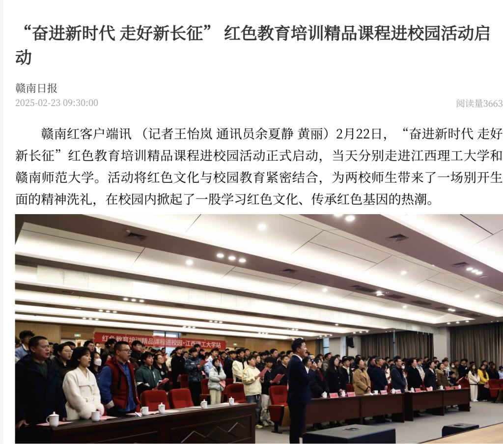 和赣南师范大学。活动将红色文化与校园教育紧密结合,为两校师生带来了一场别开生面的精神洗礼,在校园内掀起了一股学习红色文化、传承红色基因的热潮。