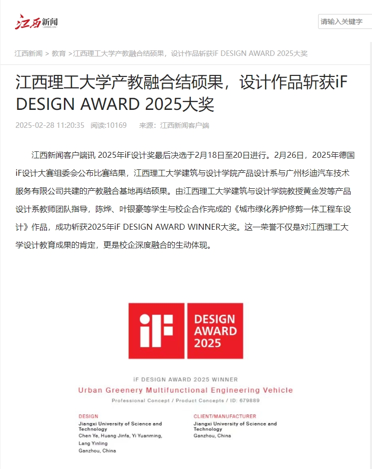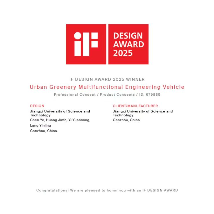 建筑与设计学院教授黄金发等产品设计系教师团队指导,陈烨、叶银豪等学生与校企合作完成的《城市绿化养护修剪一体工程车设计》作品,成功斩获2025年iF DESIGN AWARD WINNER大奖。这一荣誉不仅是对颜射