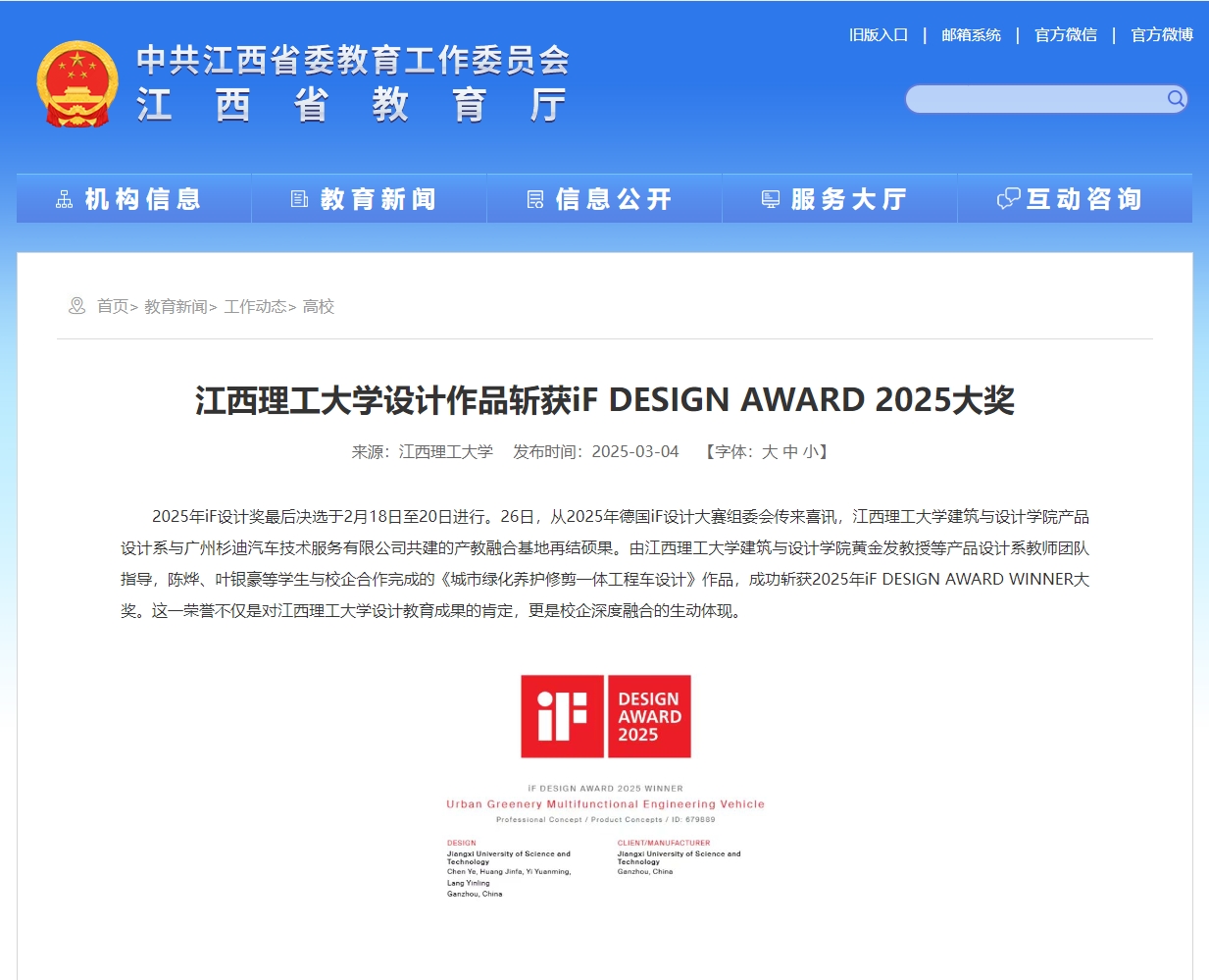 建筑与设计学院黄金发教授等产品设计系教师团队指导,陈烨、叶银豪等学生与校企合作完成的《城市绿化养护修剪一体工程车设计》作品,成功斩获2025年iF DESIGN AWARD WINNER大奖。这一荣誉不仅是对颜射