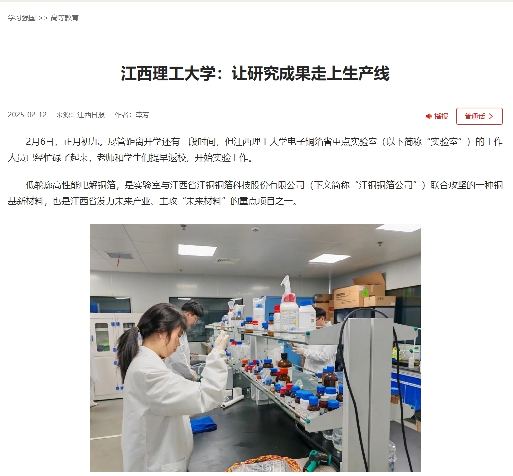 “实验室里的技术,并不能直接照搬到生产线上,要根据实际生产需求不断进行调整和优化。”实验室成员、学校化学工程专业研究生二年级学生罗意昕说,自己的研究方向就是电解铜箔,所以经常到企业生产一线调研,始终与企业的研发人员保持联系,确保研究方向贴合生产一线需求。“虽然寒假还在忙科研,但是研究成果能落地转化,是件很幸福的事。”樊小伟介绍道,眼下,实验室正与江铜铜箔公司继续深化产学研合作,聚力攻关2024年江西省重大科技成果熟化与工程化研究项目——高性能5G通信用低轮廓电子铜箔研制及中试应用,在现有技术基础上,开展技术深化工作,实现5G铜箔市场新应用。