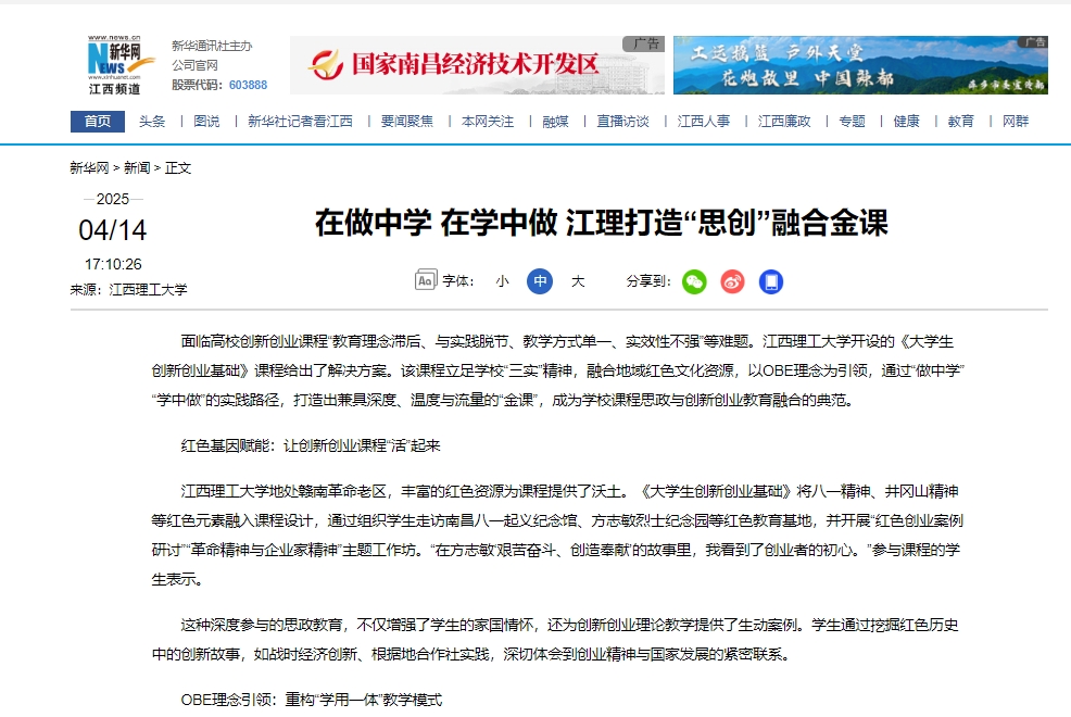 地处赣南革命老区,丰富的红色资源为课程提供了沃土。《大学生创新创业基础》将八一精神、井冈山精神等红色元素融入课程设计,通过组织学生走访南昌八一起义纪念馆、方志敏烈士纪念园等红色教育基地,并开展“红色创业案例研讨”“革命精神与企业家精神”主题工作坊。“在方志敏‘艰苦奋斗、创造奉献’的故事里,我看到了创业者的初心。”参与课程的学生表示。