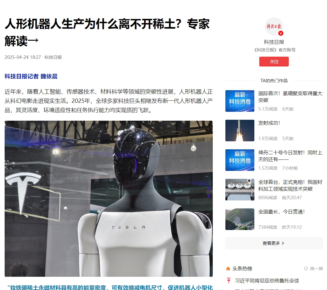 “钕铁硼稀土永磁材料具有高的能量密度,可有效缩减电机尺寸,促进机器人小型化轻量化,降低电机能耗,还能避免传统电机因扭矩不足引发活动范围受限问题,令机器人简单高效完成行走、跳跃等复杂动作,是人形机器人制备过程中不可或缺的材料。”4月24日,颜射