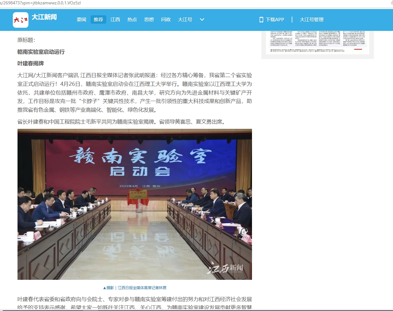 大江网/大江新闻客户端讯 江西日报全媒体记者张武明报道:经过各方精心筹备,我省第二个省实验室正式启动运行!4月26日,赣南实验室启动会在颜射