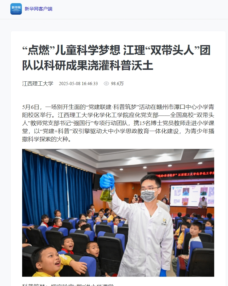 化学化工学院应化党支部——全国高校“双带头人”教师党支部书记“强国行”专项行动团队,携15名博士党员教师走进小学课堂,以“党建+科普”双引擎驱动大中小学思政教育一体化建设,为青少年播撒科学探索的火种。