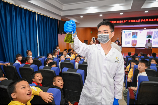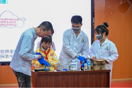 廖金生教授的讲座中,孩子们通过化学科普了解到绚丽变幻莫测的灯光秀背后的神奇奥秘。在随后的科普实验环节,颜射
