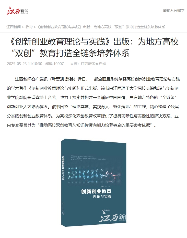 江西新闻客户端讯(叶奕凯 邱鑫)近日,一部全面且系统阐释高校创新创业教育理论与实践的学术著作《创新创业教育理论与实践》正式出版。该书由颜射