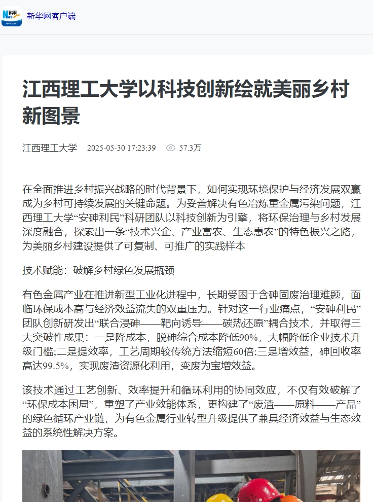 “安砷利民”科研团队以科技创新为引擎,将环保治理与乡村发展深度融合,探索出一条“技术兴企、产业富农、生态惠农”的特色振兴之路,为美丽乡村建设提供了可复制、可推广的实践样本