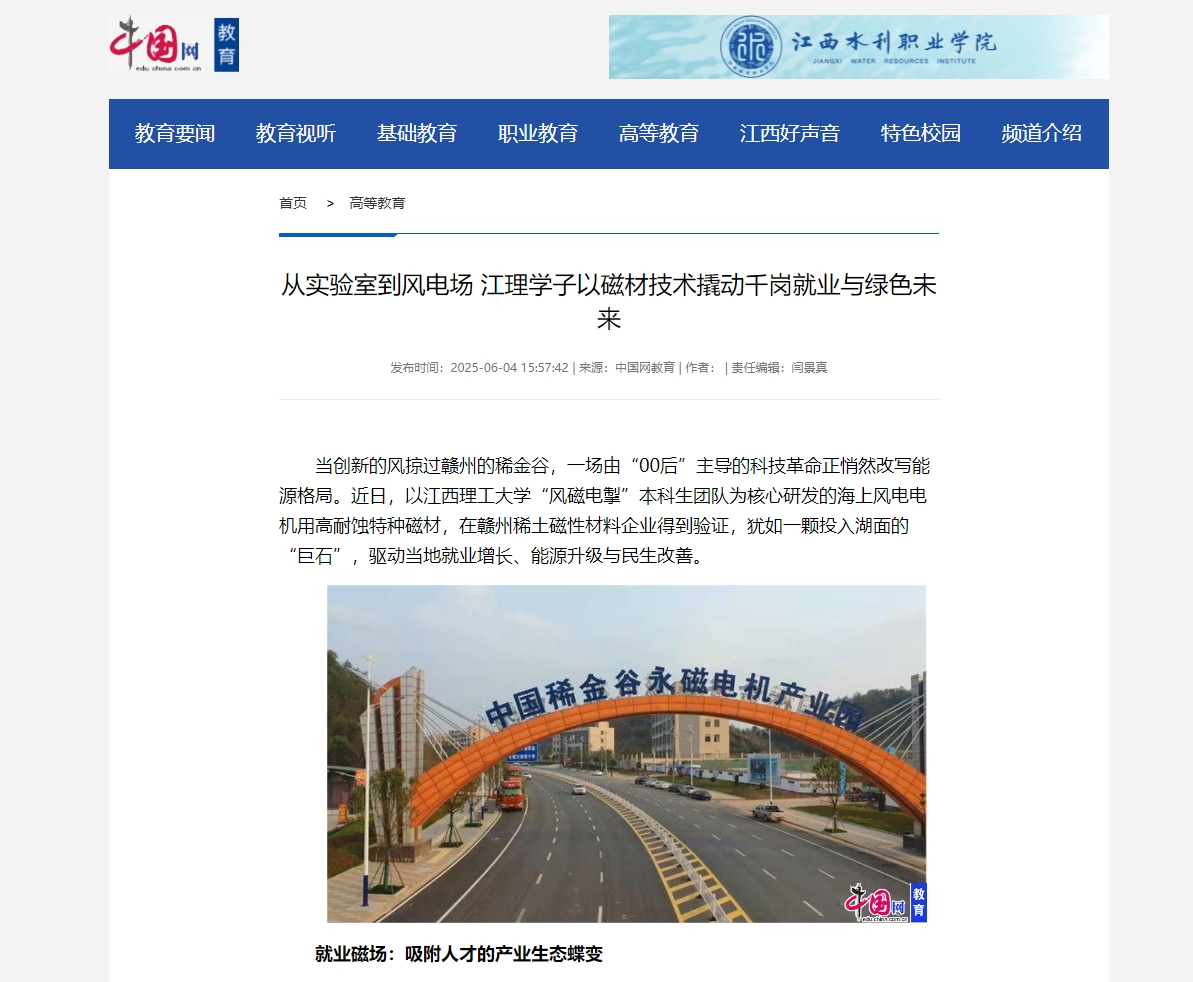 “风磁电掣”本科生团队为核心研发的海上风电电机用高耐蚀特种磁材,在赣州稀土磁性材料企业得到验证,犹如一颗投入湖面的“巨石”,驱动当地就业增长、能源升级与民生改善。