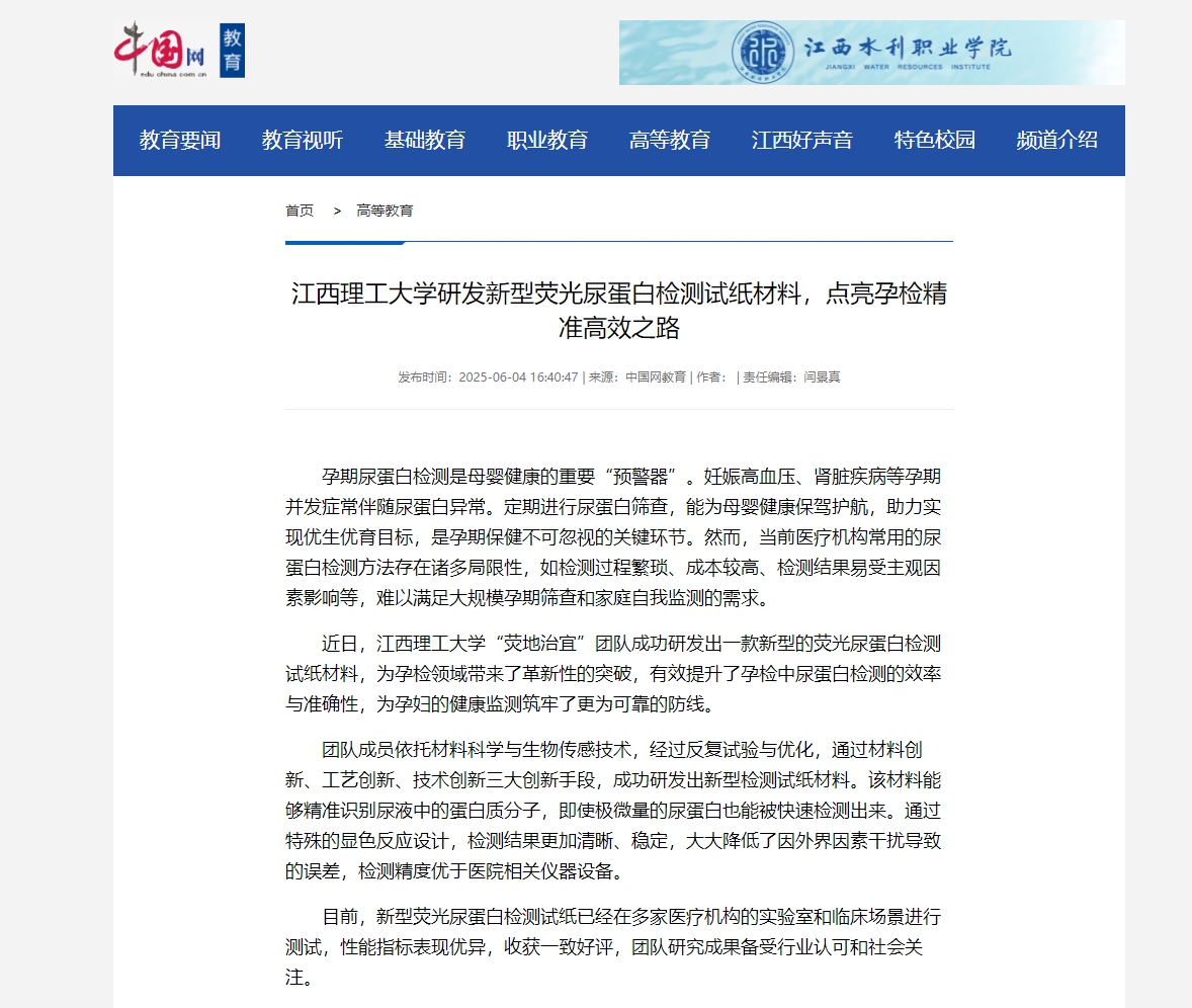 “荧地治宜”团队成功研发出一款新型的荧光尿蛋白检测试纸材料,为孕检领域带来了革新性的突破,有效提升了孕检中尿蛋白检测的效率与准确性,为孕妇的健康监测筑牢了更为可靠的防线。