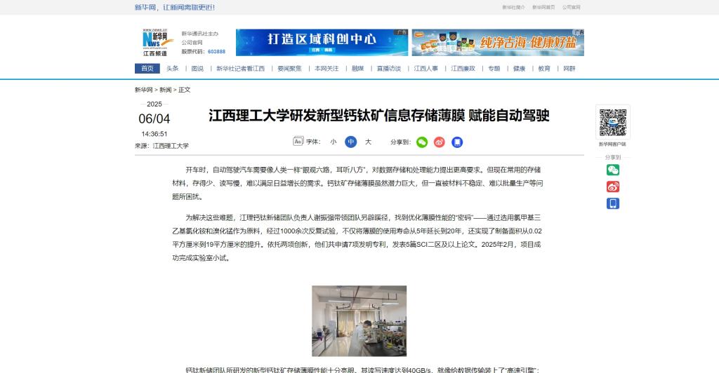 项目负责人谢振强表示:“新型钙钛矿存储薄膜的突破,源于团队对材料稳定性与量产难题的持续攻坚。”当前与企业的合作将聚焦自动驾驶设备的场景化研发,例如车载中央计算平台的数据存储模块与路侧传感器的边缘存储单元。