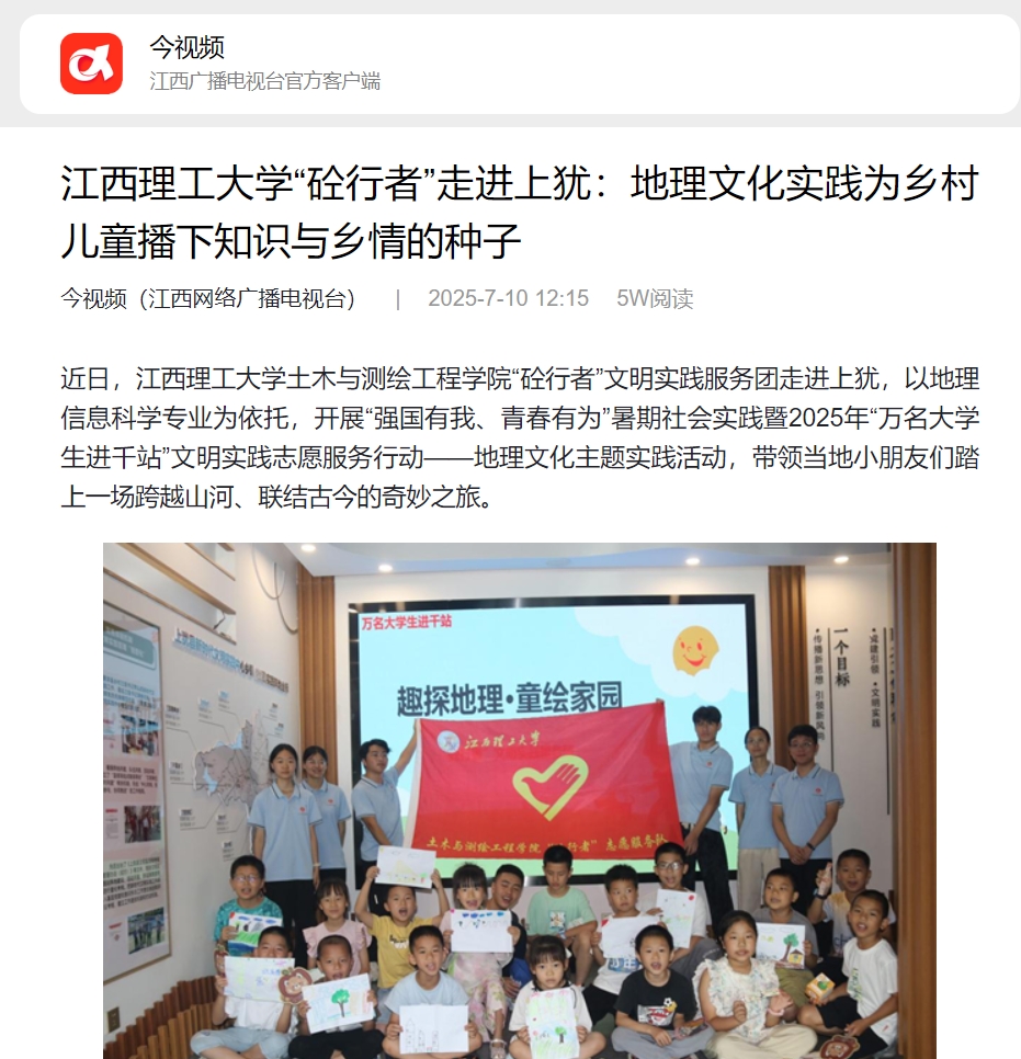 土木与测绘工程学院“砼行者”文明实践服务团走进上犹,以地理信息科学专业为依托,开展“强国有我、青春有为”暑期社会实践暨2025年“万名大学生进千站”文明实践志愿服务行动——地理文化主题实践活动,带领当地小朋友们踏上一场跨越山河、联结古今的奇妙之旅。