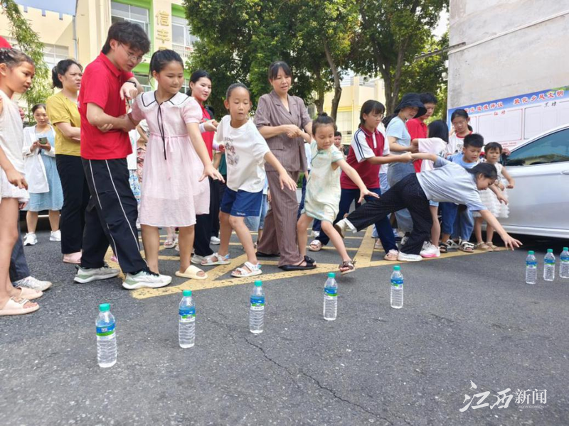 实践队队员精心设计了乡村生活气息浓厚的亲子游戏,让亲情在协作中升温。“捶背暖心”游戏中,家长与孩子在口令下互相捏肩捶背,简单的动作传递浓浓爱意,欢声笑语洋溢幸福。在考验默契的“协作取水”环节,孩子灵活取水,家长稳稳守护;或是家长细心指引,孩子默契配合。每一次成功触碰都伴随着欢呼,每一次扶持都是信任的见证。“最打动我的,是孩子跌倒时家长第一时间伸出的手,以及孩子尝试时家长全神贯注的眼神。”队员丁梦阳感慨道。