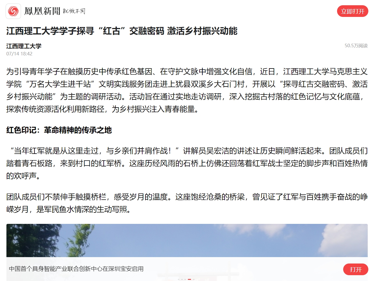 团队成员们不禁伸手触摸桥栏,感受岁月的温度。这座饱经沧桑的桥梁,曾见证了红军与百姓携手奋战的峥嵘岁月,是军民鱼水情深的生动写照。